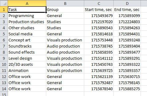 We rummaged through our old junk and remembered our time tracker with the epic name Ergomant. And we remembered it because we use it ourselves and record the periods of different life events. And now, with a whole bunch of these events logged, we realized it'd be brilliant to organize all that data into a spreadsheet (Excel would do), but we'd initially forgotten to add that feature to our tracker!